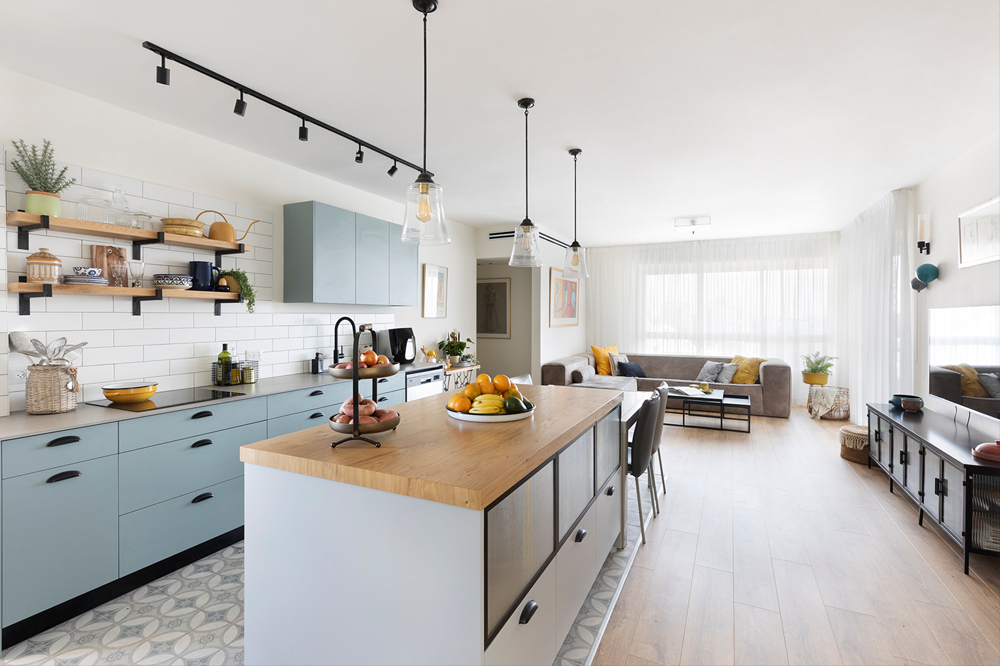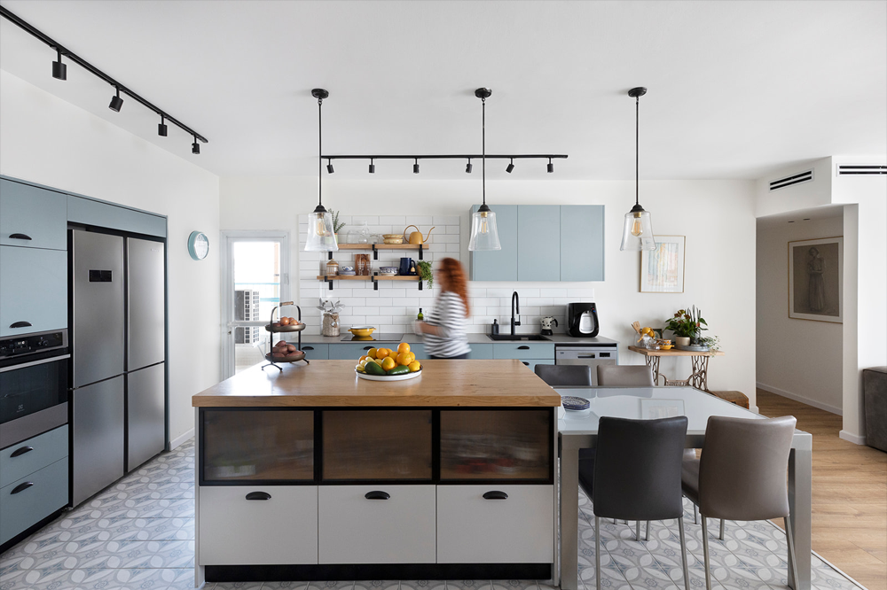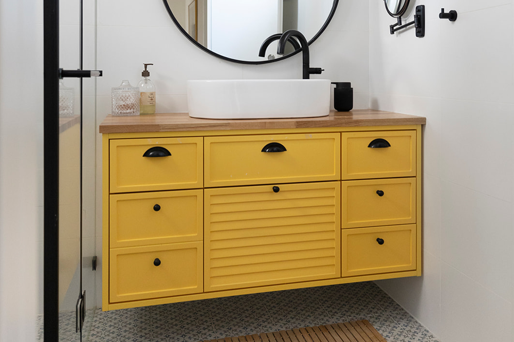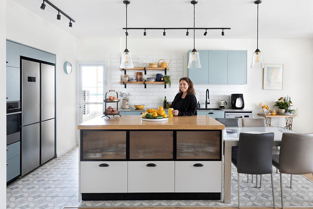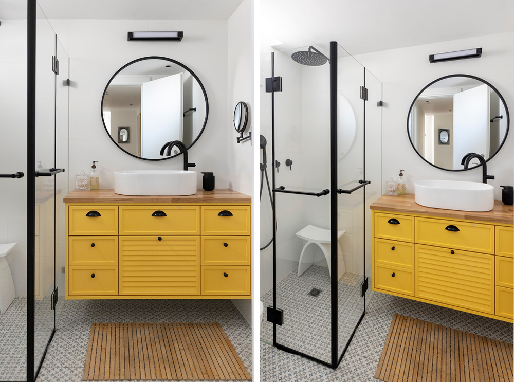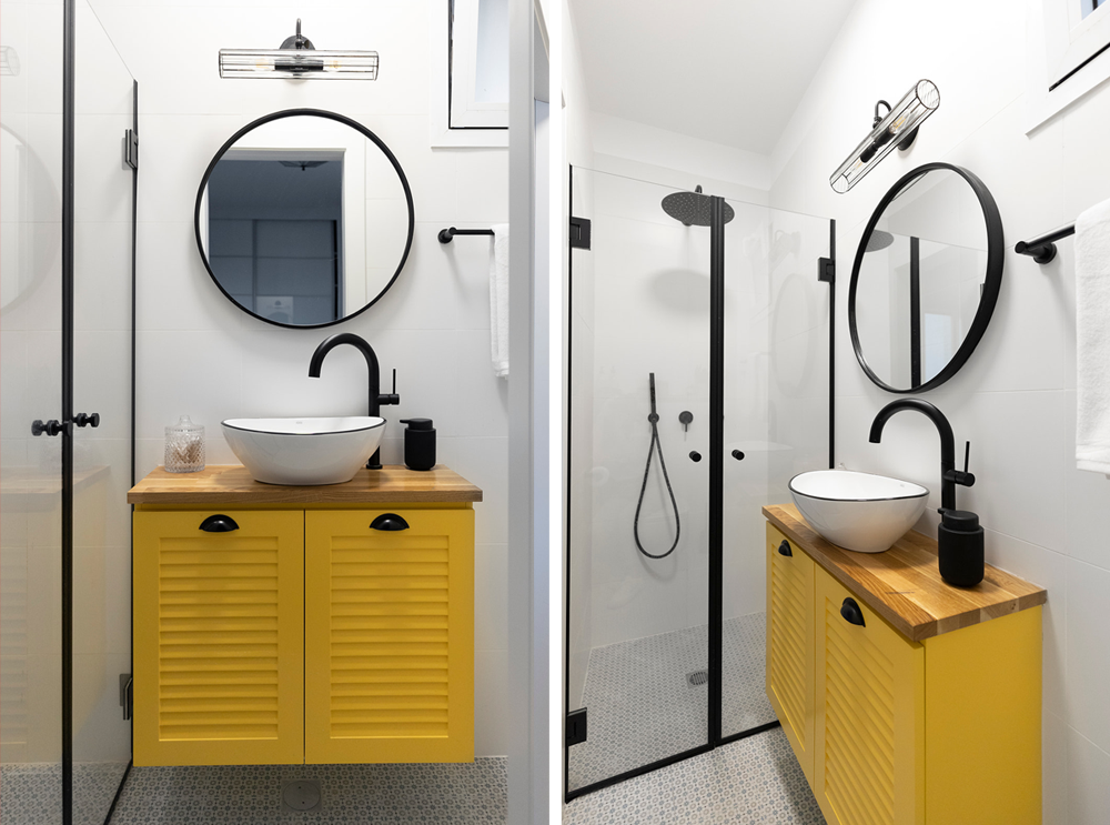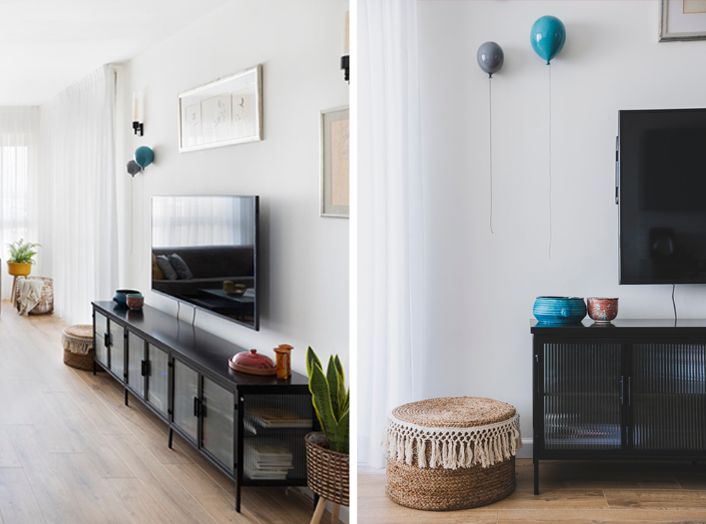 חומרי גלם מעניינים נוספים שנבחרו – ארונות אמבטיה בסגנון כפרי עם ידיות שחורות ומראות עם מסגרת שחורה, מזנון ושולחן סלון במתכת בצבע שחור ושילוב זכוכית פסים ועד לתמונות, כלים ואקססוריז, המשלימים את החוויה האקלקטית בבית.