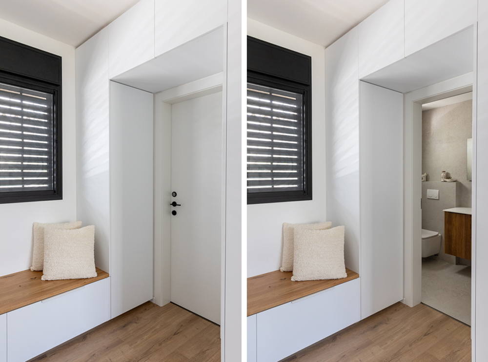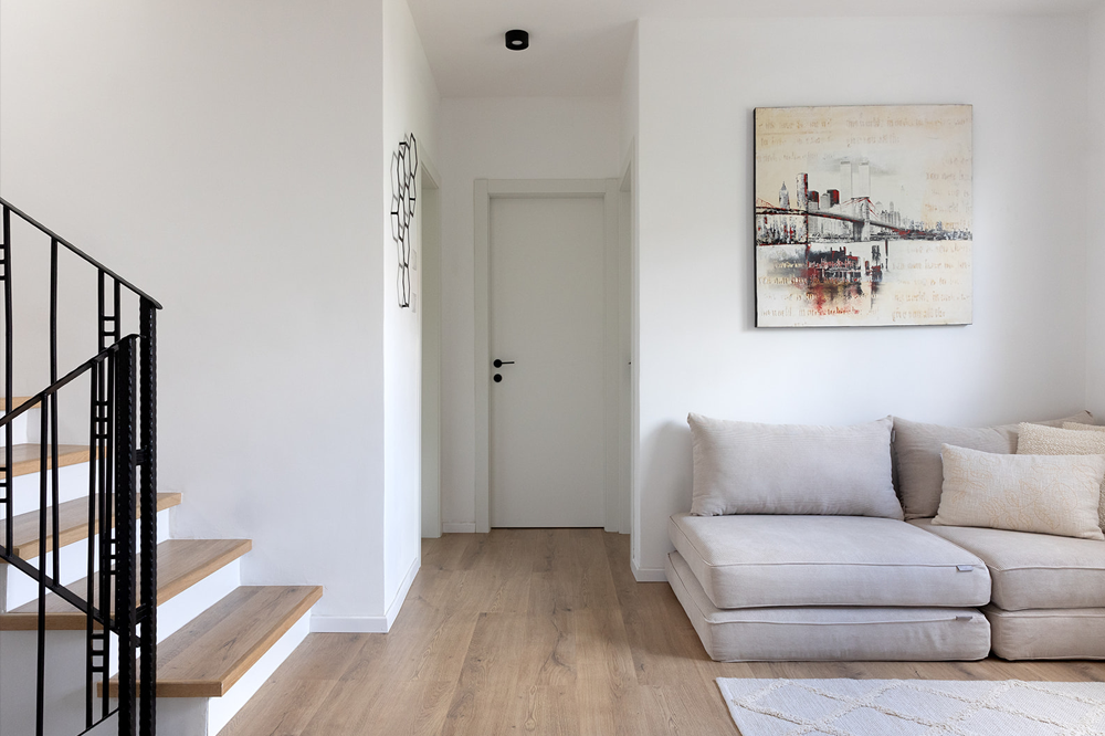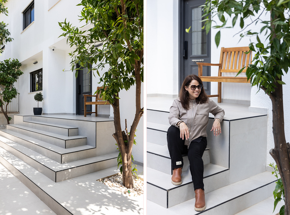 הפתרון – המדרגות תוכננו מחדש, נבנו בגבהים א-סימטריים, הורחבו ופתחו את חלל הכניסה. בשלב הבא הן נוצלו ליצירת מקומות ישיבה מזמינים, בכך הן הפכו לפיצ'ר נוסף בחלל, בו אפשר לשבת ולהנות מחוץ לבית.