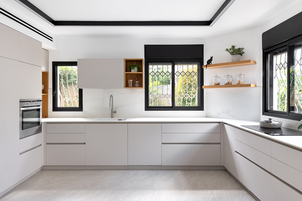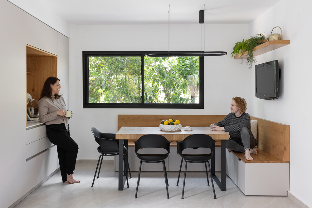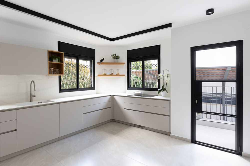 בין החללים המשמעותיים ביותר, הוגדר המטבח, לב ליבו של הבית, שקיבל תשומת לב מיוחדת, ועוצב מחדש, בעזרת עבודת נגרות, בקווים נקיים ומודרניים. בתכנון החדש נוצר חלל אחד, הנשען על מאפייני המטבח האמריקאי הנקרא breakfast nook”", אשר מאופיין באזור ישיבה, המשלב ספסל עם איחסון ושולחן אוכל, כחלק אינטגרלי מהמטבח. לתוך חלל זה, התווספה דלת כניסה, המובילה מאזור החנייה אל המטבח המודרני ושוקק החיים.